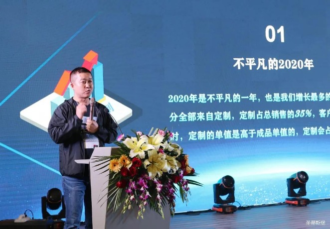 华灯璀璨的开场仪式,点燃了现场如火如荼的气氛。BB贝博艾弗森集团营销总经理陈玉伟先生对晚会进行了主题发言,他对2020年的营销工作进行了总结,并着重从营销工作部署、重点项目开展、产品整合、拎包帮扶、渠道运营和移动+定制整装优势等方面对2021年的营销工作做了全面的统筹规划。同时,他还讲解了“美国梦凯莎床垫”新品的产品工艺、市场优势、产品定位,使经销商对我们的新产品拥有更深入的认识和了解。